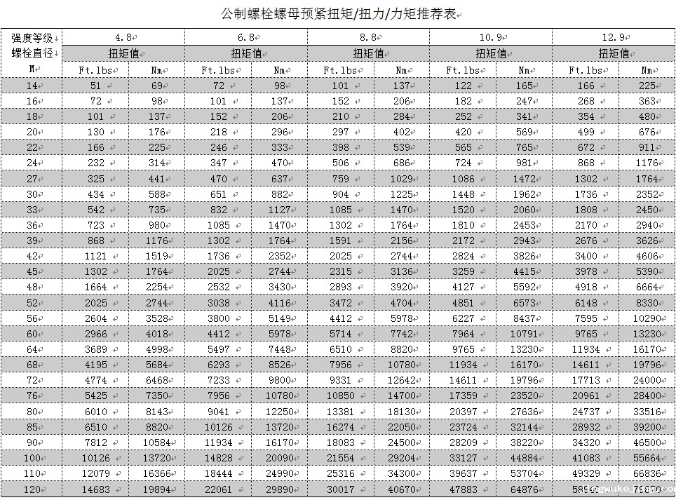 公制螺栓螺母预紧扭矩/扭力/力矩推荐表