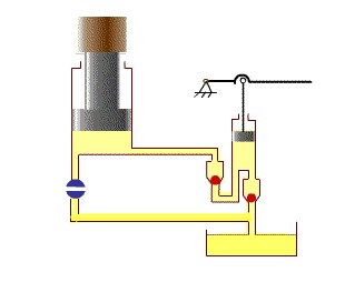 在平衡的系统中,比较小的活塞上面施加的压力比较小,而大的活塞上施加的压力也比较大,这样能够保持液体的静止。所以通过液体的传递,可以得到不同端上的不同的压力,这样就可以达到一个变换的目的。
