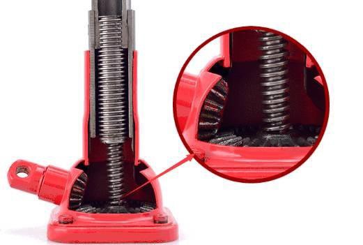 机械千斤顶以往复扳动手柄,拔爪即推动棘轮间隙回转,小伞齿轮带动大伞齿轮、使举重螺杆旋转,从而使升降套筒获得起升或下降,而达到起重拉力的功能。