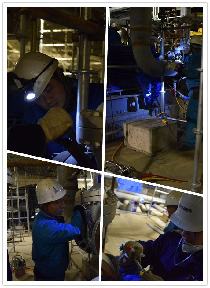 △管廊下一组钳工在厂家的监督下紧固螺栓