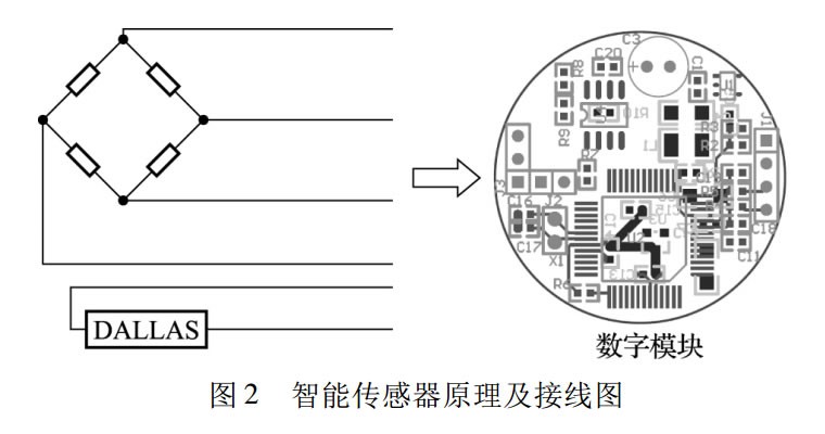 将模拟应变式传感器经过组桥后直接将电桥的电压模拟信号接入单片机 CS5530 的模拟输入端,通过 CS5530的A/D 转换器将电压信号转换成数字信号, 单片机对时钟电路、复位电路、电源电路、串行通讯模块、存储模块进行控制,通过编程处理后按照一定的格式将数据通过 RS485 串行通讯接口输出。采用DALLAS2401半导体芯片。该芯片在工厂生产时,刻入经检测的64位注册码(8位家族码+48位序列码+8位CRC校验码),因此可以保证没有任何两个器件的注册码是相同的。采用低成本 TSOC 表面贴封装,方便装在传感器插头或接线腔中。原理图如图2所示。