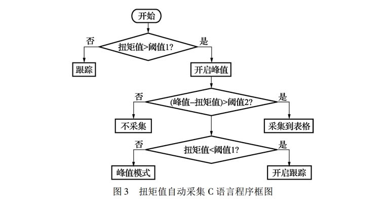 大多数仪表只具有显示功能不具有数据采集和分析功能,校准人员在校准时,一边操作校准装置,一边用笔记录校准数据。这样不但工作效率低还容易出错。为了方便校准员做记录,仪表专门设计了数据采集功能,采集表格形式完全按照 JGJ707—2014《扭矩扳子检定规程》的表格形式[7,这样方便后面的计算和出证书。仪表采用具有C语言功能的触摸屏作为显示终端。校准人员可以通过设定最大扭矩值和采集触发值, 实现扭矩值的自动采集。并根据采集数据进行平均值和示值相对误差和示值重复性的计算。C 语言程[8]框图如图3 所示。其中阈值1表示进入峰值模式的判断条件,阈值2表示采集峰值判断条件。当扭矩值超过阈值 1,仪表自动从跟踪模式变为峰值模式。当峰值和当前的扭矩值之差大于阈值 2 时,程序会将峰值自动采集到表格中,然后解除峰值功能。阈值1和2的设定根据智能传感器的量程来计算得到。本设备中阈值1为传感器满量程值的5%,阈值2为满量程值的2/3。