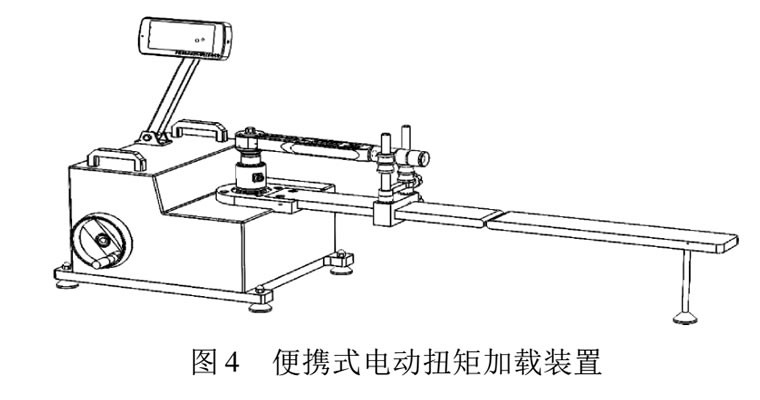 为方便现场检定使用,整个设备必须方便携带。因此检定装置的支撑臂采用可折叠式,扭矩传感器也采用直插式,现场不需任何工具就可以安装和拆卸加载装置。智能仪表采用可伸缩支架固定,方便调整角度。整个装置的结构示意图如图 4 所示。因为大部分的现场装置考虑到电源的问题, 所以多是采用手动加载的方式。这样在被检扳手从刚装上到加上扭矩会有一段空行程, 全部采用手动加载,一方面比较费力,另一方面工作效率也不高。因此,在加载方式上采用手动和电动相结合的方式,装置中加一个储能式电机来实现空行程的电动加载,节省人力,提高效率, 当空行程结束传感器加上力后就可以改成手动加载。