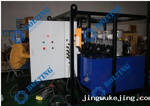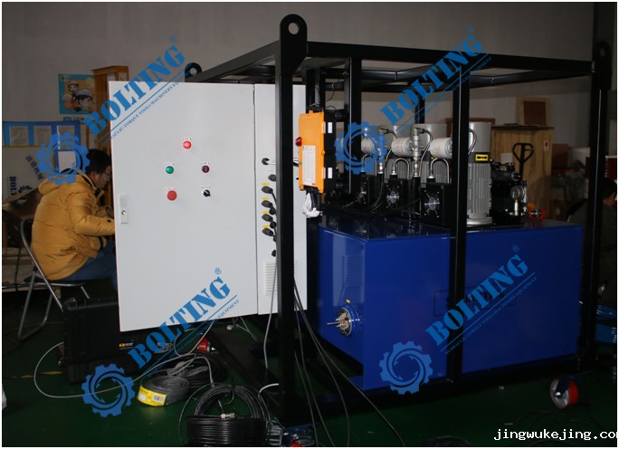 (1) 液压动力单元配置四台 HAWE 高 效RZ系列电动泵供油,正常情况下一台电动泵为1台液压油缸供油; (2) 同时可以通过外部管路连接后,替代原有4台泵中的一台为其连接的液压油缸供油; (3) 高频电磁换向阀用于顶升/缩回控制; (4) 一个 800L 可用液压油容量的油箱为系统的应用和循环冷却提供充足的油量; (5) 配置液压油冷却器可以及时冷却液压油,防止工作过程中液压油温度上升过快; |