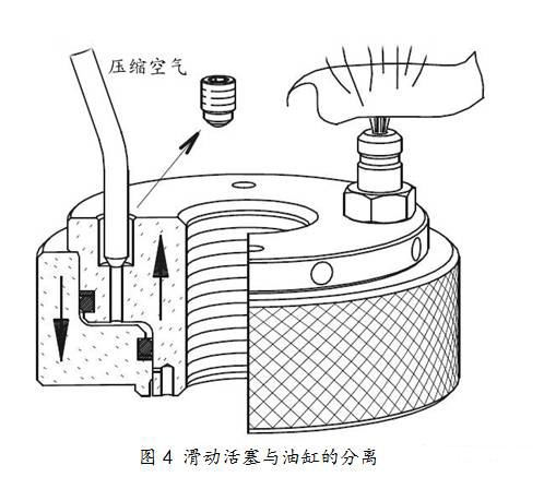 滑动活塞与油缸的分离:松掉放气螺钉,用压缩空气吹放气口,活塞很容易从油缸中滑出(见图4);