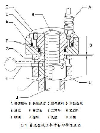 米兰体育网站官网首页是一种比较先进的螺栓装配方法,特别适用于狭窄空间和重负荷振动机械坚固。其主要部件有(见图1)滑动活塞D、油缸E、支撑环G、密封圈F、放气螺钉C和快速接头A等。米兰体育网站官网首页的工作原理是米兰体育网站官网首页安装于螺栓的上部,滑动活塞的内螺纹旋到螺栓上部的螺纹内,从气动液压油泵来的高压油通过快速接头连接到由油缸E和滑动活塞D形成的密封空间内,液压油作用在滑动活塞上,使滑动活塞对螺栓J施加外力进行轴向拉伸,被施加力的螺栓在其弹性变形区内被拉长,螺栓拉长后旋紧螺帽I,这样螺栓就会被锁在拉长的位置上。