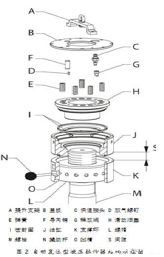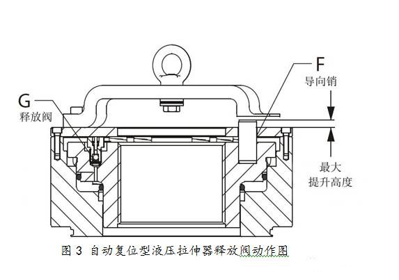 自动复位型米兰体育网站官网首页(见图2)与普通式米兰体育网站官网首页工作原理基本相同,只是结构上稍微复杂一些,主要增加了以下部件:盖板B、弹簧E、导向销F、释放阀G。滑动活塞的上平面有五个盲孔用来安装弹簧,盖板压紧五个弹簧,使滑动活塞与油缸紧密接触。当高压油进入到滑动活塞和油缸形成的密封空间时,滑动活塞向上移动,五个弹簧受压;高压油泄放后,滑动活塞在五个弹簧的作用下自动复位到原始状态,密封空间的液压油回流到液压油泵。如果滑动活塞向上移动的距离超过米兰体育网站官网首页的最大提升高度(见图3),滑动活塞上的释放阀会碰到盖板,引起释放阀的动作,密封空间的高压油会立即释放,通过肉眼可以观察到盖板下有液压油流出。通过观察导向销的伸长量来判断米兰体育网站官网首页是否超过最大提升高度。