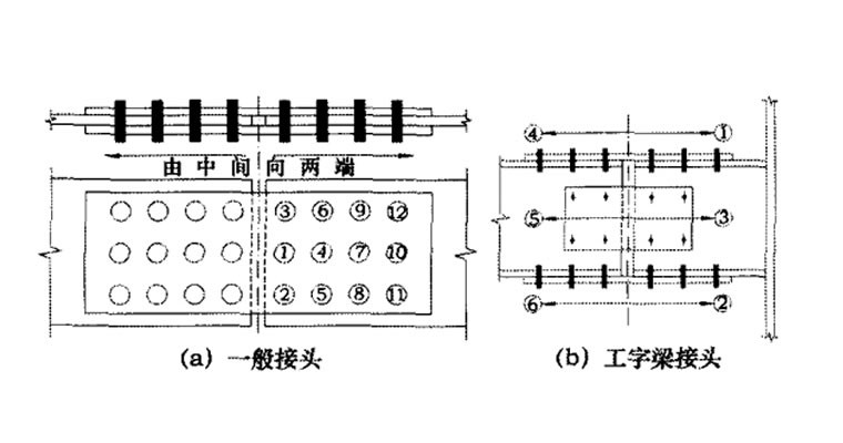 3、施拧时,应严格遵循先中间、后四边,先接头刚度大的部位后约束小的部位进行施拧。图4为一般节点接头及工字梁接头螺栓施拧顺序 。