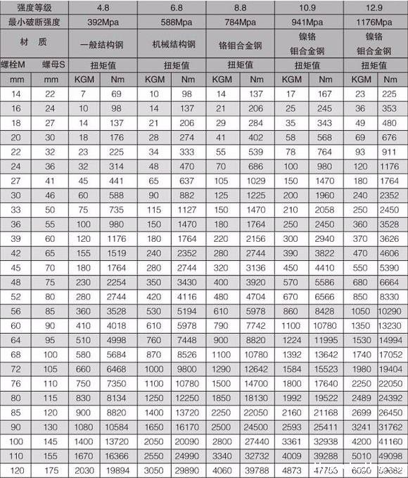 相信许多用户在选购液压扭矩扳手之前都看过米兰app官网版下载扭矩对照表,米兰app官网版下载扭矩对照表其实就是螺栓扭矩值推荐表,它主要被用来查询螺栓螺母的强度等级、材质和螺栓大小扭矩值的一张表格,能够更好的帮助用户选择合适的扳手型号,下图就是米兰app官网版下载扭矩对照表。