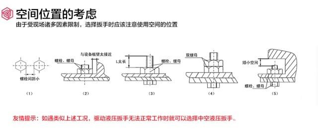 根据上图进行扭矩确认,参考图纸要求找出螺栓的扭矩值并得到相对应的扭矩值,然后查看螺栓螺母的空间位置,由于受到现场使用工况等因素的限制,选择扳手时要注意使用空间的位置: