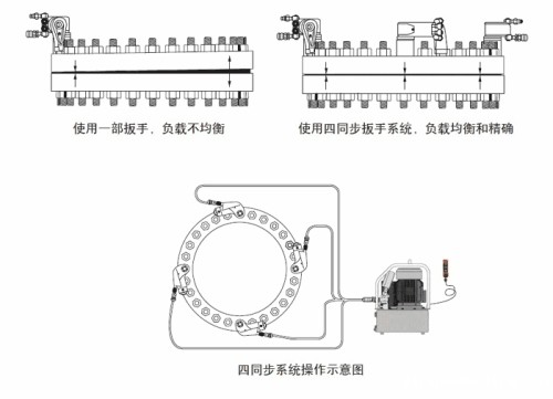 四同步系统的主要目的是为了避免法兰面单边受压模式,这种模式会导致法兰面的垫片因挤压过度而失效,从而引起泄露。四同步系统是四部扳手同时接在一台泵上使用。根据液压原理,四部扳手同时工作,同时输出设定扭矩,即可实现法兰平行闭合,其扭矩精确度能达到±3%。四同步系统可一次将螺栓锁紧,而单系统需要多次加载,分步锁紧,因此四同步系统效率远大于单系统的四倍。