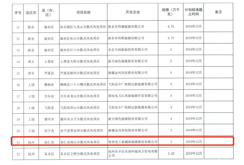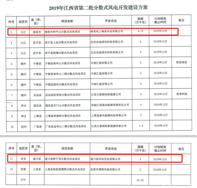 根据11月中旬江西省能源局陆续下达的《2019年江西省第一批分散式风电开发建设方案》和《2019年江西省第二批分散式风电开发建设方案》,特变电工新能源公司江西省两个批次共拿下117.5MW风电项目,包括崇仁县相山30MW分散式风电项目、瑞昌市和平山47.5MW分散式风电项目、遂川县轿子顶40MW分散式风电项目。