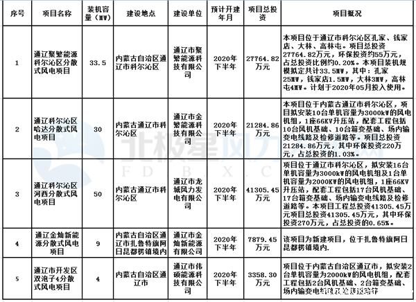 日前内蒙古自治区通辽市生态环境局对5个分散式风电建设项目环境影响评价文件作出审批意见,共计装机126.5MW,总投资约101,592万元,项目预计2020年下半年开建。项目详情如下: