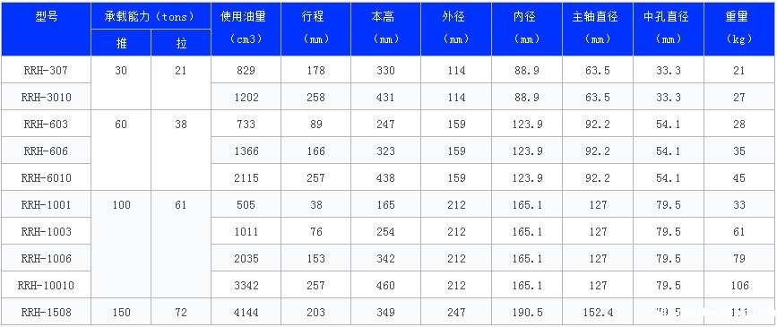 中空油缸(双作用) ◆ 溢流阀在过载时保护油缸免受损坏; ◆ 烤漆表面提高抗腐蚀能力; ◆ 液压缸在最大行程亦能承载最大荷重; ◆ 外环螺纹更易安装(除RRH-1001和RRH-1508) ◆ 双作用