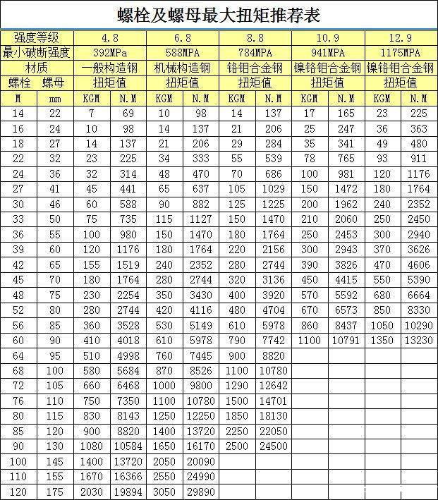 在了解了米兰app官网版下载的分类之后,那么米兰app官网版下载规格型号有哪些?在不同工况下,如何进行米兰app官网版下载选型?大家可以根据现成的扭矩值和空间尺寸进行选型;如果不知道扭矩值,可以根据提供的螺栓规格和螺栓强度等级,参考《螺栓螺母规格与扭矩值推荐表》中的推荐值进行计算选型,具体的大家可以参考下面这张《螺栓螺母规格与扭矩值推荐表》。