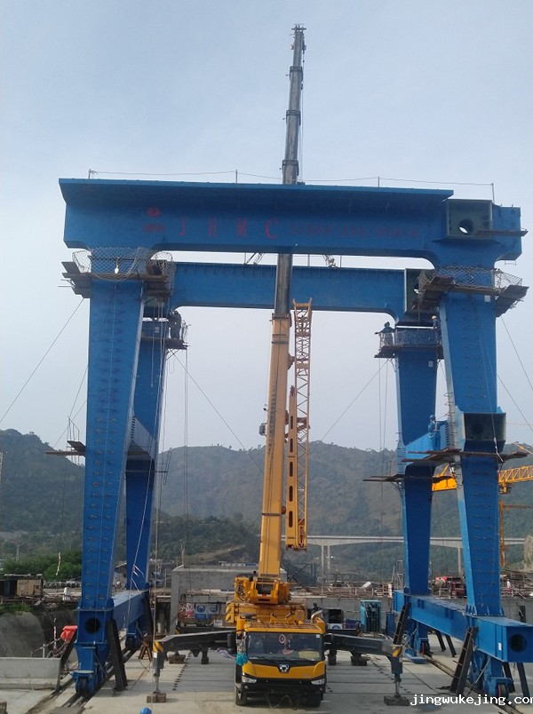 该门式启闭机为2×800/600/600千牛双向门机,总重约382吨,主要由小车、门架、大车行走机构、左右回转吊等结构组成;本次进水塔双向门机是卡洛特水电站安装的首台永久启闭设备,主要用于进水塔闸门、拦污栅的安装及清污。