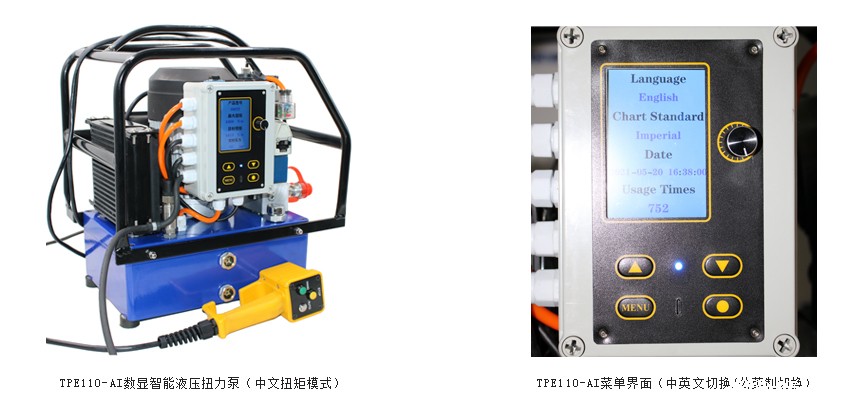 ◆ 采用机械压力表与电子LED数显双闭环控制显示,压力单位可选择Bar、MPa和psi等单位,操作液晶屏可切换N.m,Ft.lbs等单位,系统可选择中英文,公制和英制;